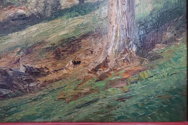 auch dieses Gemälde aus dem Nachlass lässt mich rätseln, wer der Maler ist. Die Signatur ist schamhaft dunkel in der dunklen linken unteren Ecke untergebracht. Dabei ist es meines Erachtens nach gut gemalt und komponiert. Es ist allerdings nicht "zeitgemäß". Das Motiv sagt mir gar nicht zu, weswegen wir es wohl verkaufen werden.
