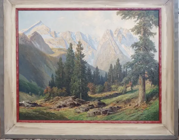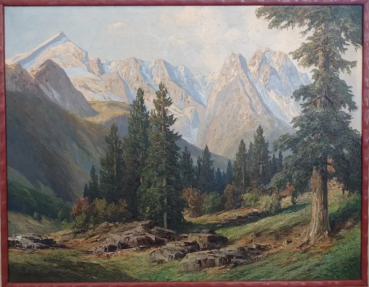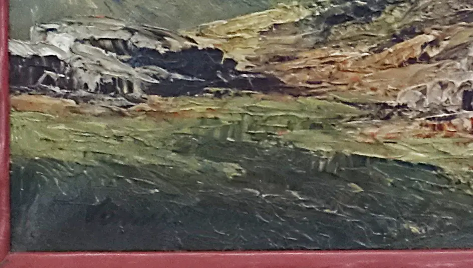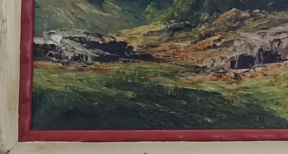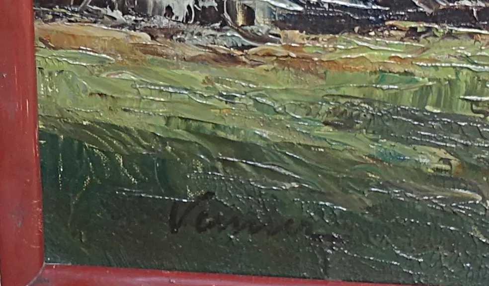auch dieses Gemälde aus dem Nachlass lässt mich rätseln, wer der Maler ist. Die Signatur ist schamhaft dunkel in der dunklen linken unteren Ecke untergebracht. Dabei ist es meines Erachtens nach gut gemalt und komponiert. Es ist allerdings nicht "zeitgemäß". Das Motiv sagt mir gar nicht zu, weswegen wir es wohl verkaufen werden.