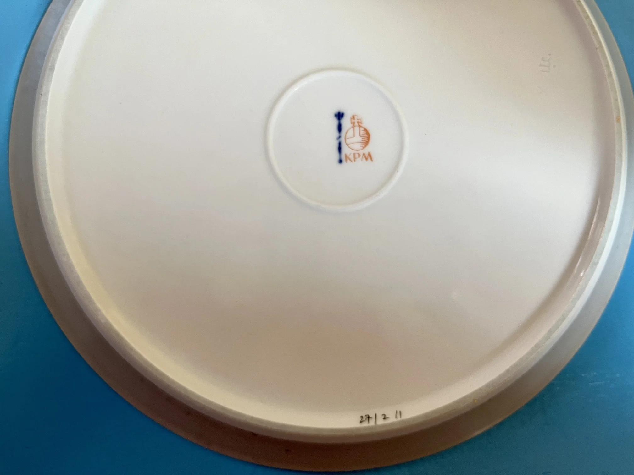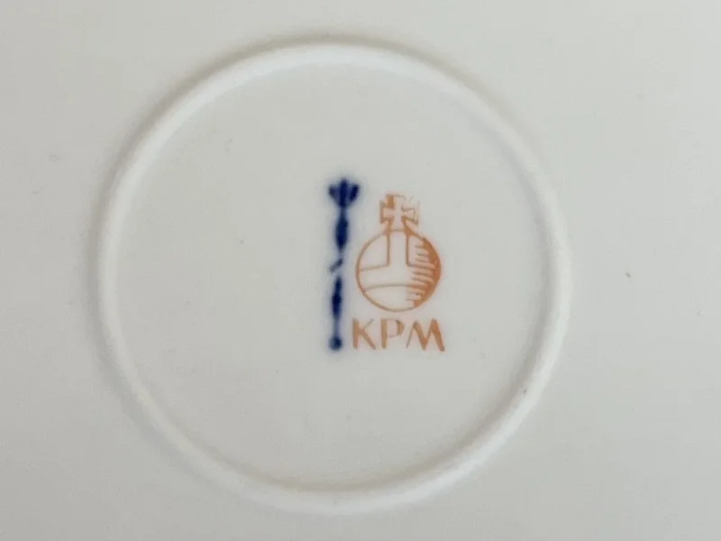 zu den Bodenmarken bzw. dem andersfarbigen Reichsapfel (mit Beginn des 20. Jh.) dann noch - der dürfte in dem ersten Beispiel-Link eher grün als blau sein - aus der Markentafel dazu "In grüner Farbe wird der Reichsapfel für alle Dekorarbeiten (Gold, Platin, Farbdekore, Monogramme und Wappen) ohne Blumen eingesetzt." ab 1913