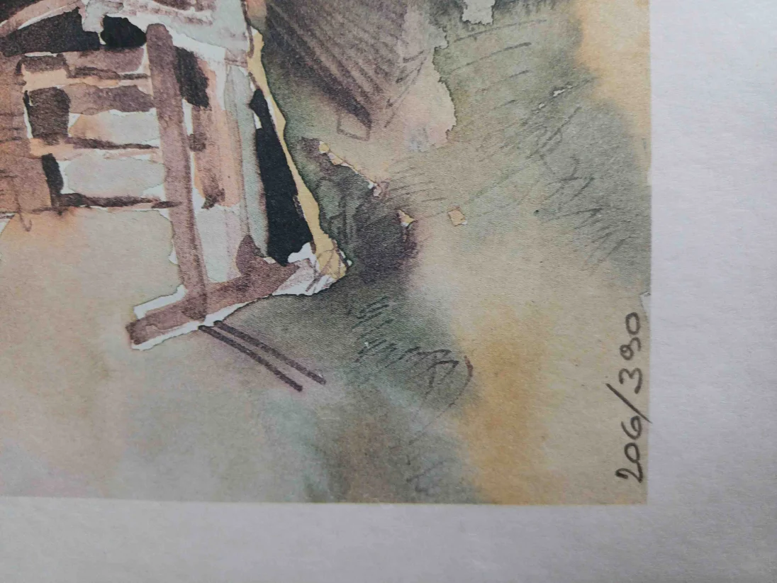 nicht ganz genau, denn für eine Sache reicht die Qualität des Fotos mit der Signatur nicht aus. Man kann das Raster im Motiv erkennen - grundsätzlich ist es ein Vervielfältigungsdruck eines Aquarells von 1989 in einer autorisierten, limitierten Auflage von eben 390 Stück, davon hier die Nummer 206. Fraglich ist eben, ob Nummerierung und Signatur in Bleistift händisch sind oder ev. die handschriftliche Signatur bereits auch mit gedruckt wurde. Bei der Auflage-Angabe ginge das ja nicht, also ist es zwar anzunehmen, aber nicht völlig sicher. Fotos bei Tageslicht draußen machen ist zu empfehlen, so ist das doch etwas zu unscharf.